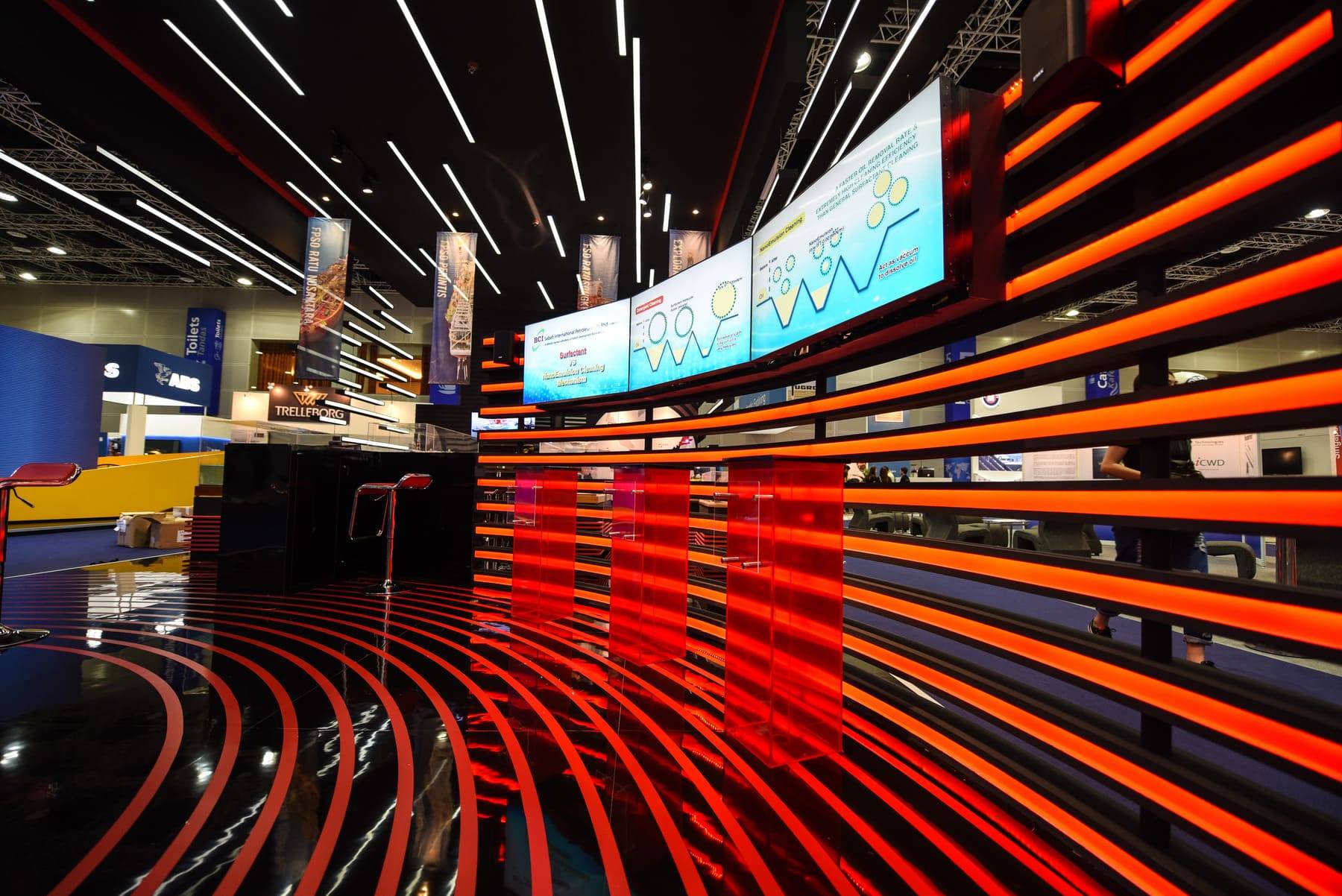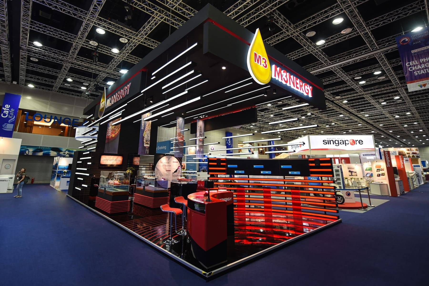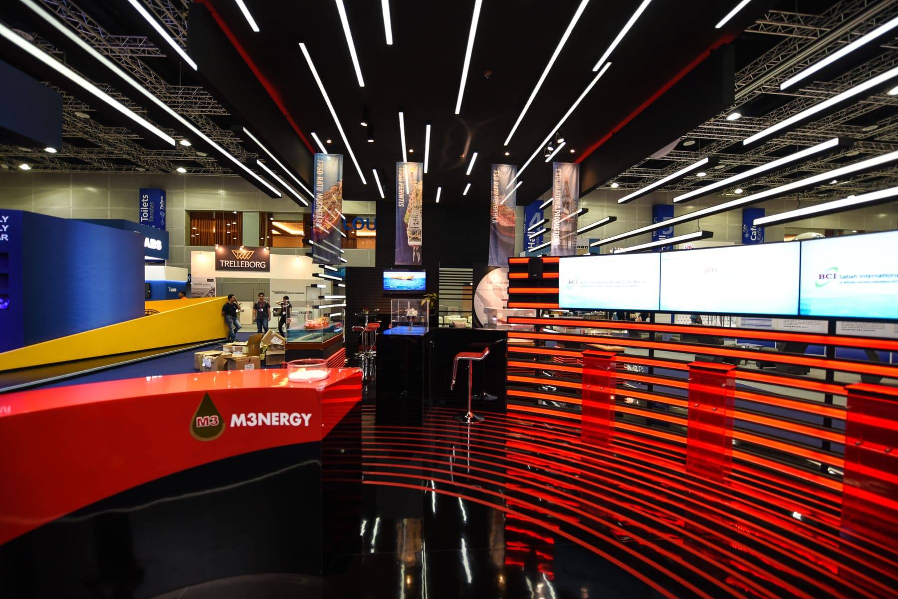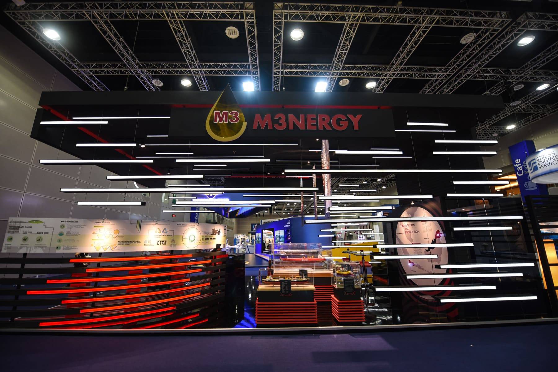 FOR M3NERGY, WE BROUGHT THE THEME OF MANOEUVRING TOWARDS EXCELLENCE TO LIFE WITH A BOLD AND DYNAMIC BOOTH DESIGN. OVER 2,000 FEET OF LED STRIPS WERE ORCHESTRATED INTO FLOWING SPEED LINES, CREATING AN ARRESTING SENSE OF FORWARD MOTION AND MOMENTUM. STYLISED MARINE RADAR BEAMS REINFORCED THE BRAND’S MASTERY IN NAVIGATING CLIENTS AND PARTNERS TOWARD SUCCESS. THE RESULT WAS A VISUALLY COMMANDING STRUCTURE THAT STOOD OUT ON THE SHOW FLOOR AND DREW SIGNIFICANT ATTENTION THROUGHOUT THE CONFERENCE
