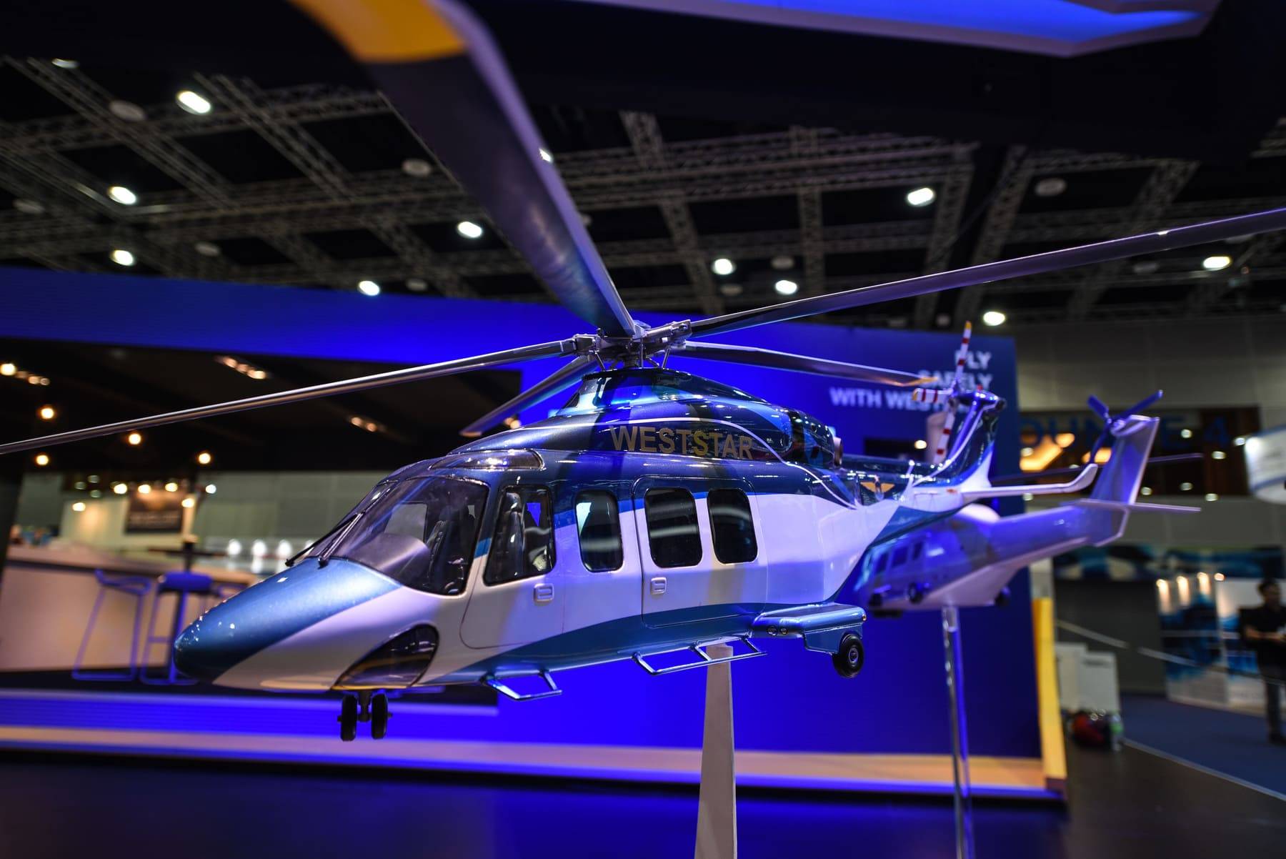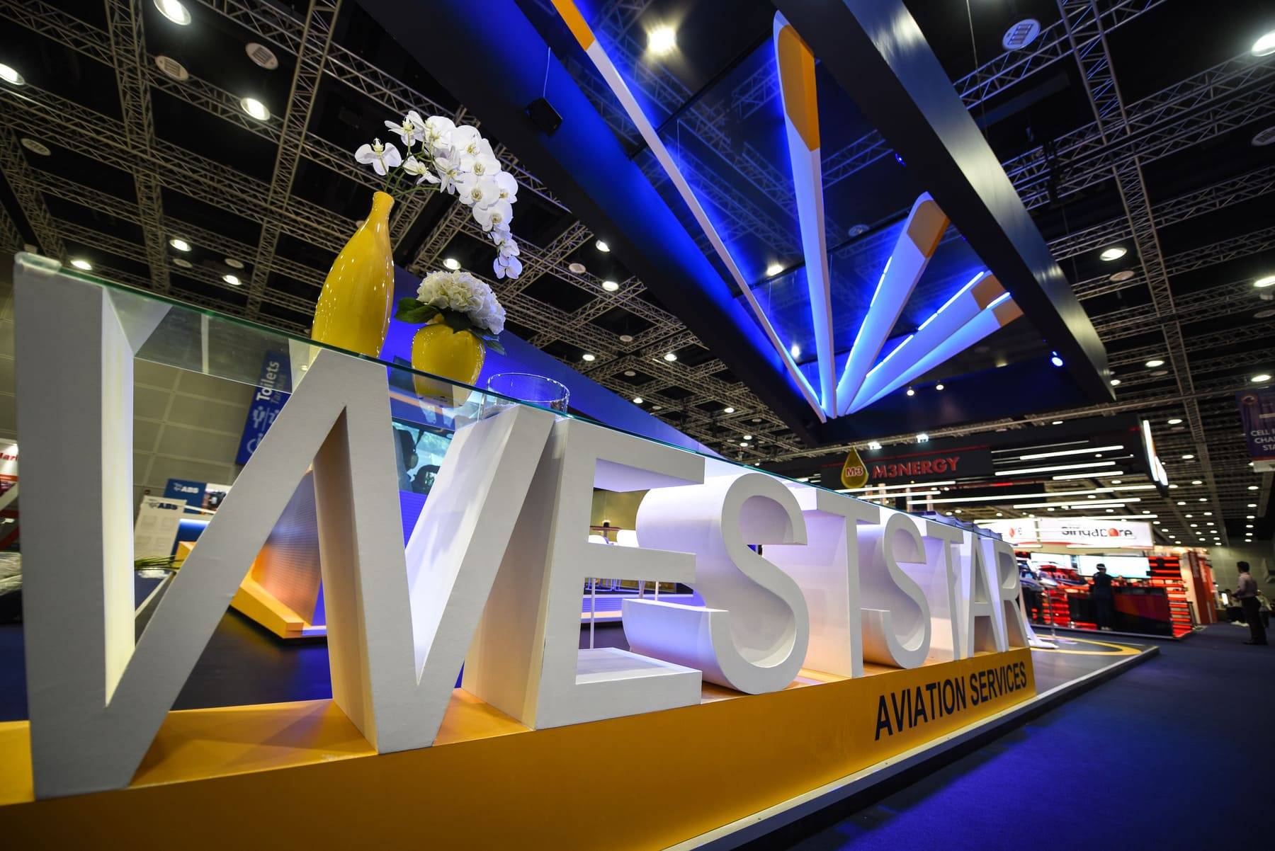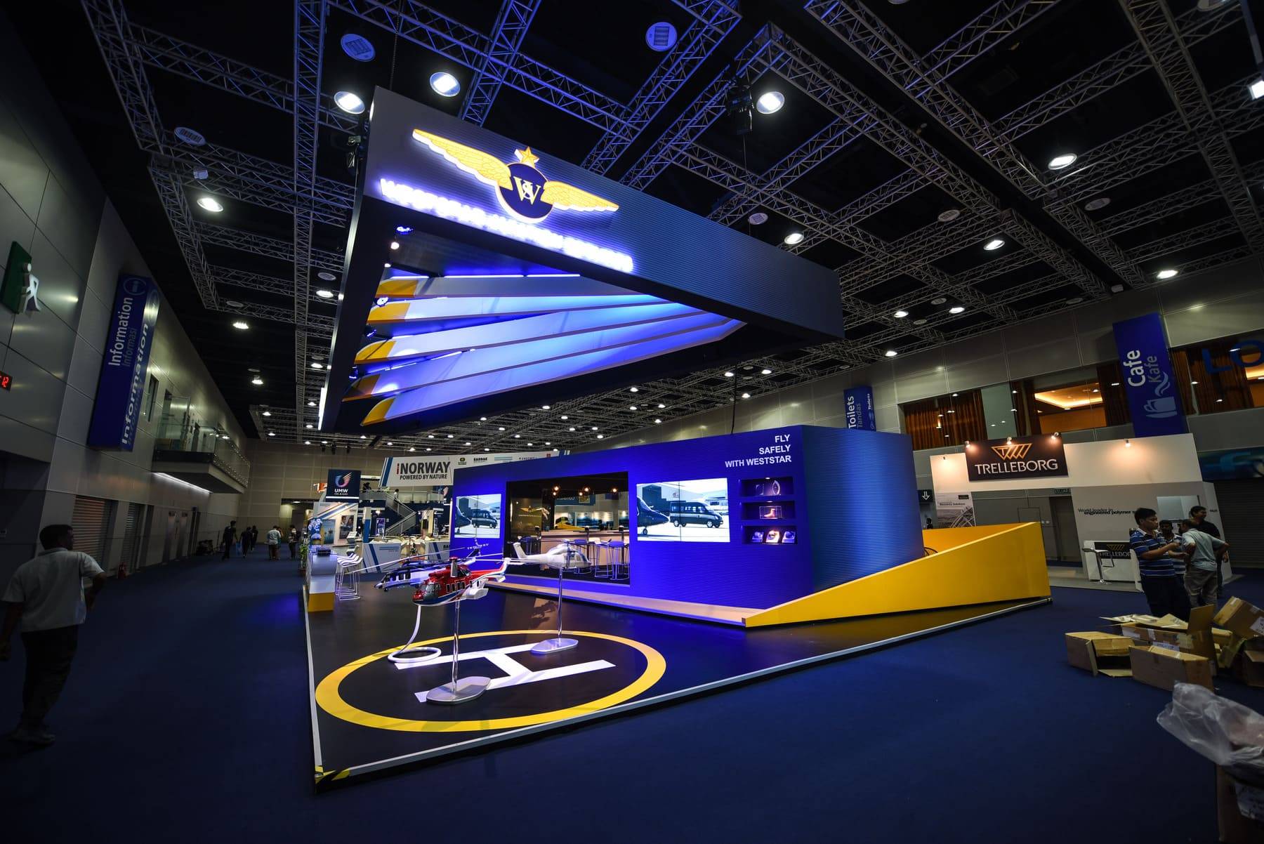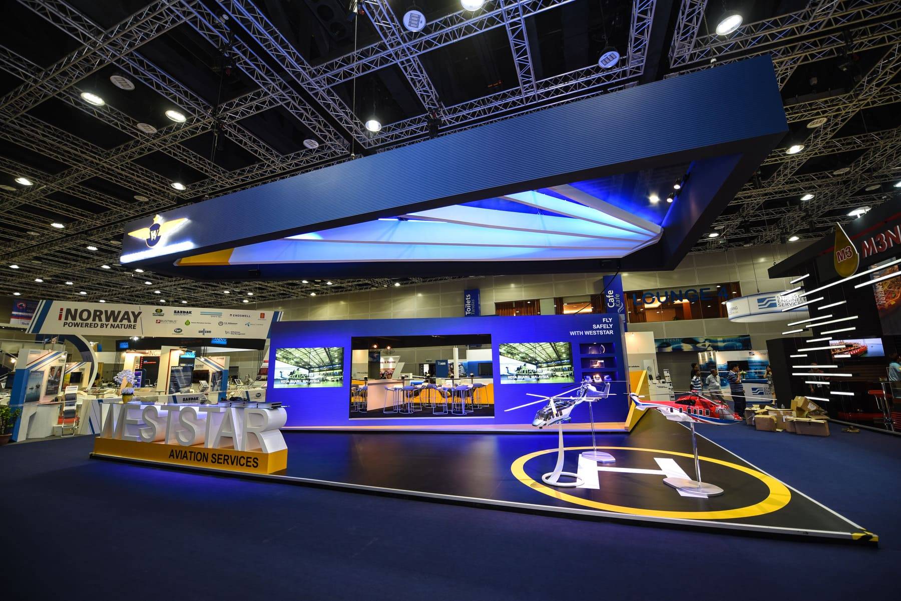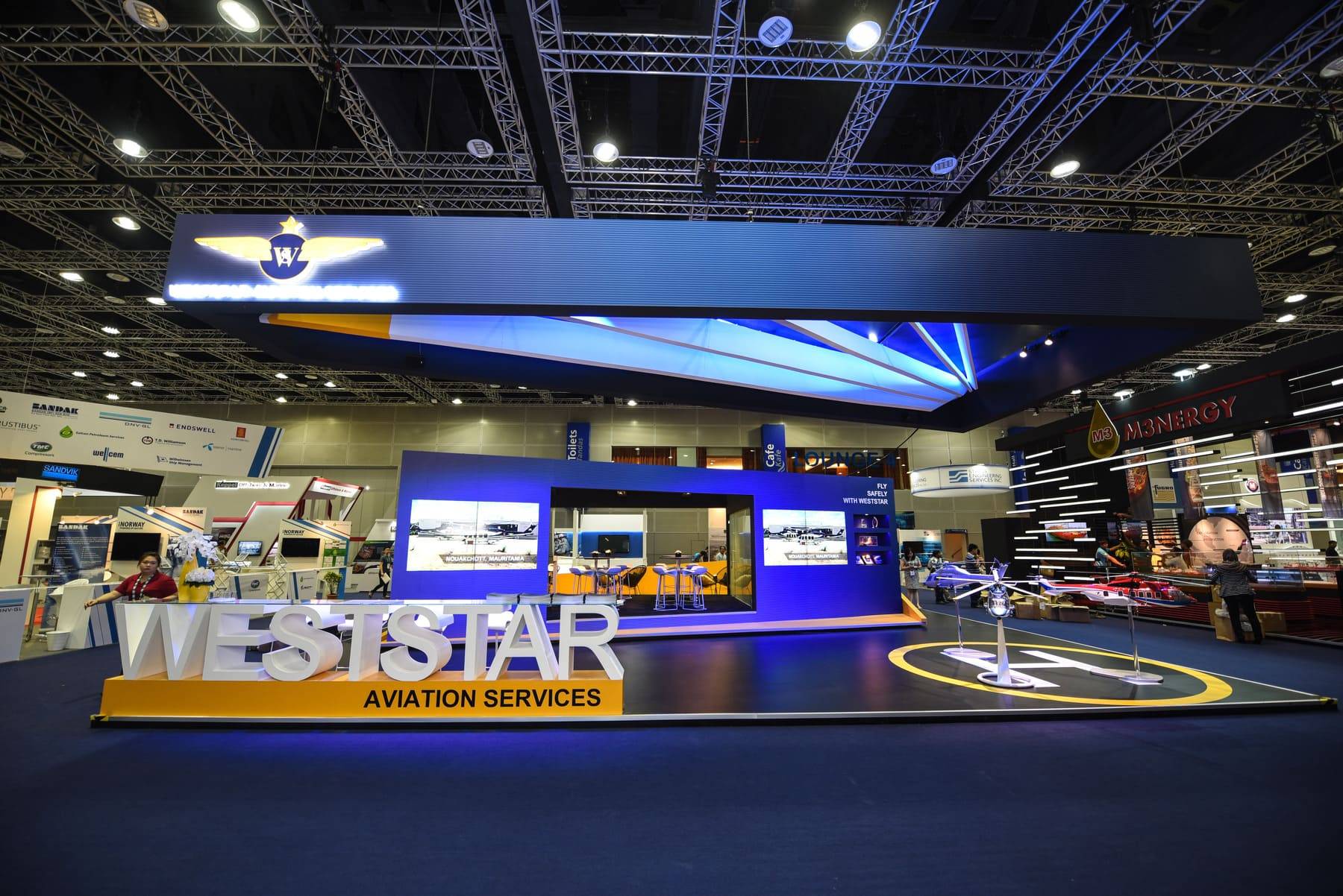 TO REFLECT WESTSTAR’S COMMANDING PRESENCE IN OFFSHORE HELICOPTER AVIATION, WE DESIGNED A BOOTH THAT CARRIED THE UNMISTAKABLE SPIRIT OF FLIGHT. A STRIKING SUSPENDED CEILING, STYLED AFTER A HELICOPTER’S ROTARY WING, BECAME THE BOOTH’S SIGNATURE FEATURE. MORE THAN JUST AN ARCHITECTURAL STATEMENT, IT CAPTURED ATTENTION, HELD CURIOSITY, AND GAVE WESTSTAR’S REPRESENTATIVES THE PERFECT STAGE TO ENGAGE WITH INDUSTRY LEADERS AND CLIENTS