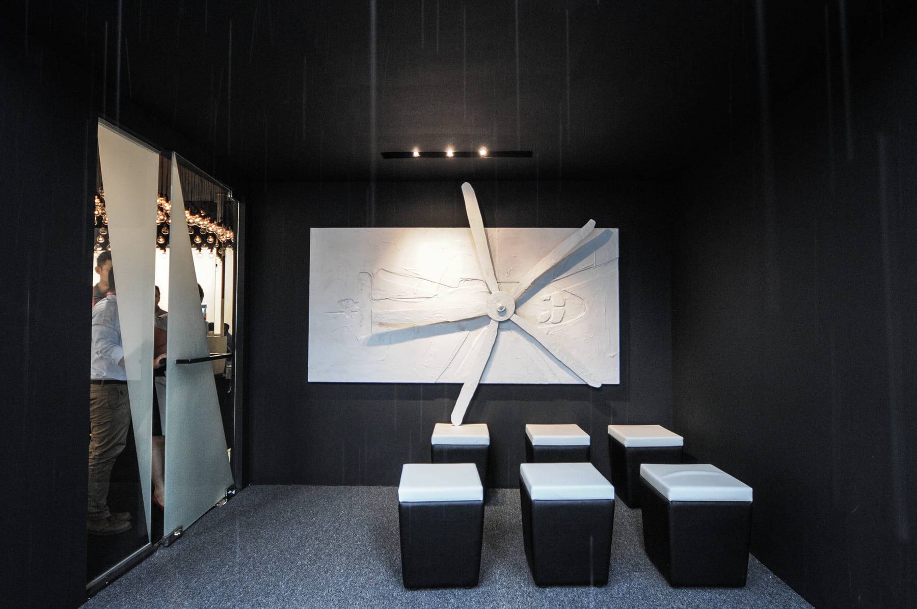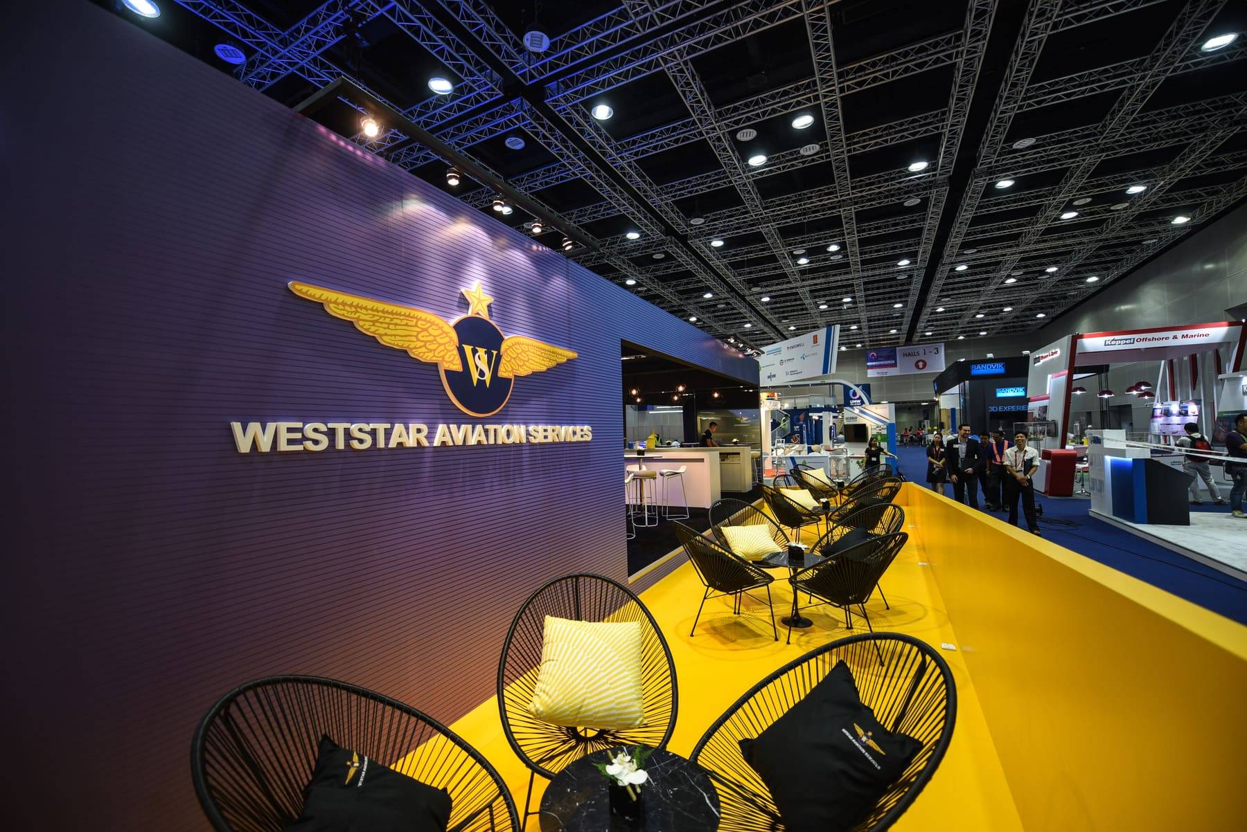 TO SHOWCASE WESTSTAR’S STRENGTH AS A PREMIER AVIATION SOLUTIONS PROVIDER, WE CREATED AN OUTDOOR LOUNGE THAT COMBINED THE IMPACT OF AN ACTUAL HELICOPTER DISPLAY WITH A GALLERY OF BESPOKE ART INSTALLATIONS. EACH PIECE DREW INSPIRATION FROM WESTSTAR’S CORE VALUES, SERVICES, AND AVIATION HERITAGE – FROM A CEILING OF SUSPENDED LIGHTS RESEMBLING FLIGHT FORMATIONS, TO ABSTRACT PROPELLER MOTIFS AND VISUAL ILLUSIONS ECHOING MOTION AND PRECISION